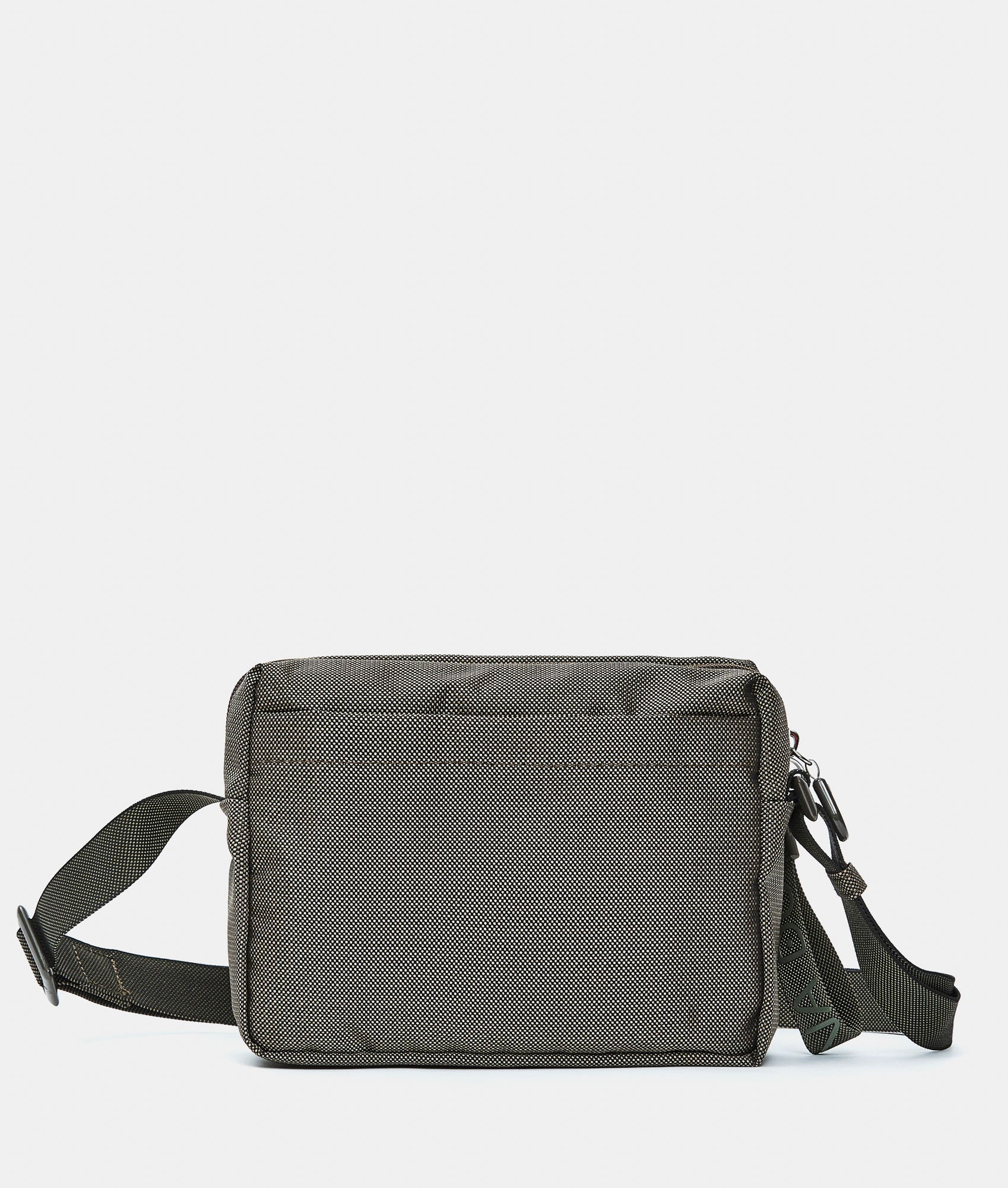 Borsa a tracolla media con tasca frontale in tessuto. Doppia portabilità, tasche smart frontali e interne, dettagli personalizzati e tracolla regolabile in jacquard.