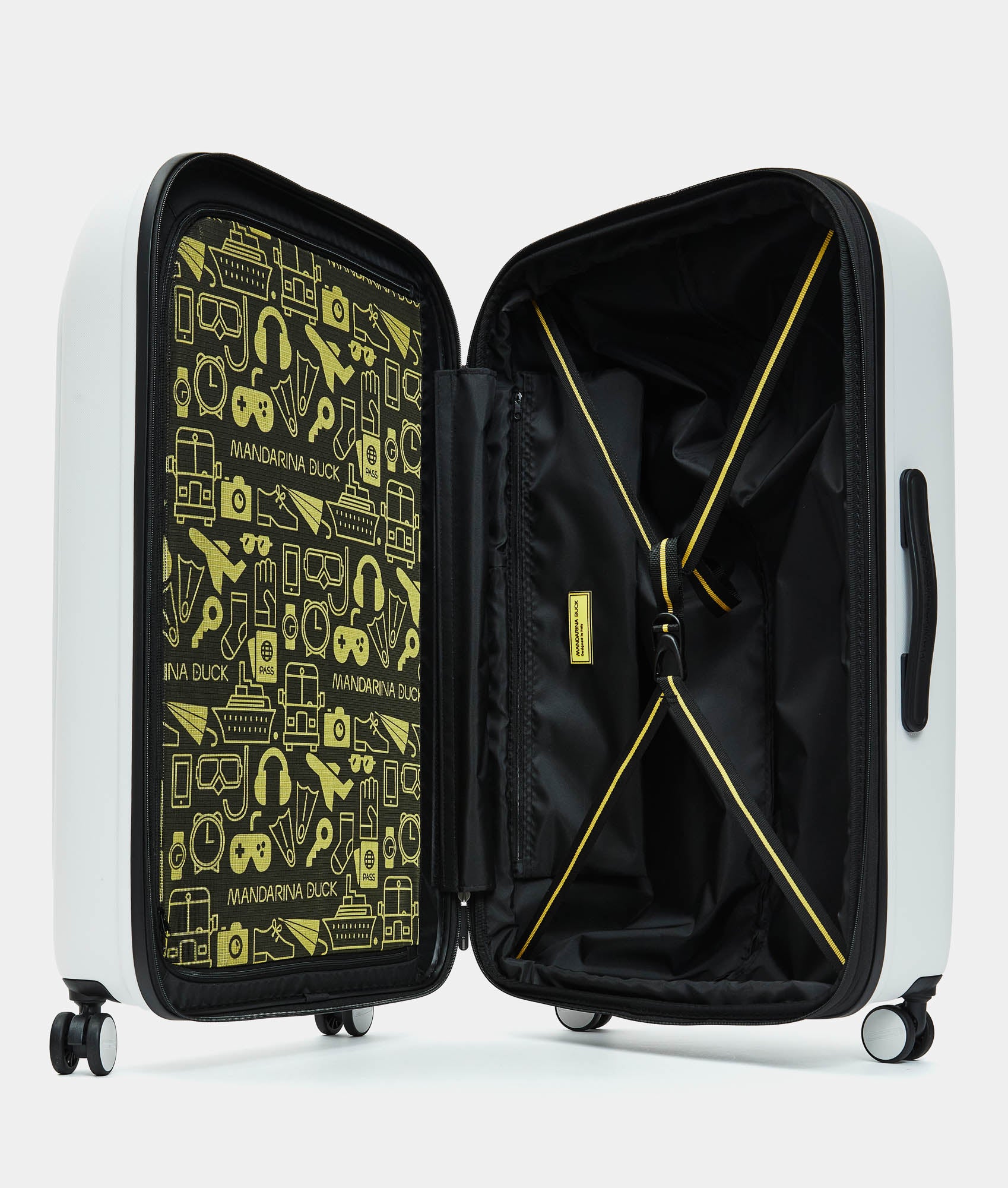 Organizzazione perfetta grazie alle cinghie elastiche incrociate nel comparto inferiore e al divisorio in fodera con tasca e rete con zip nel comparto superiore.