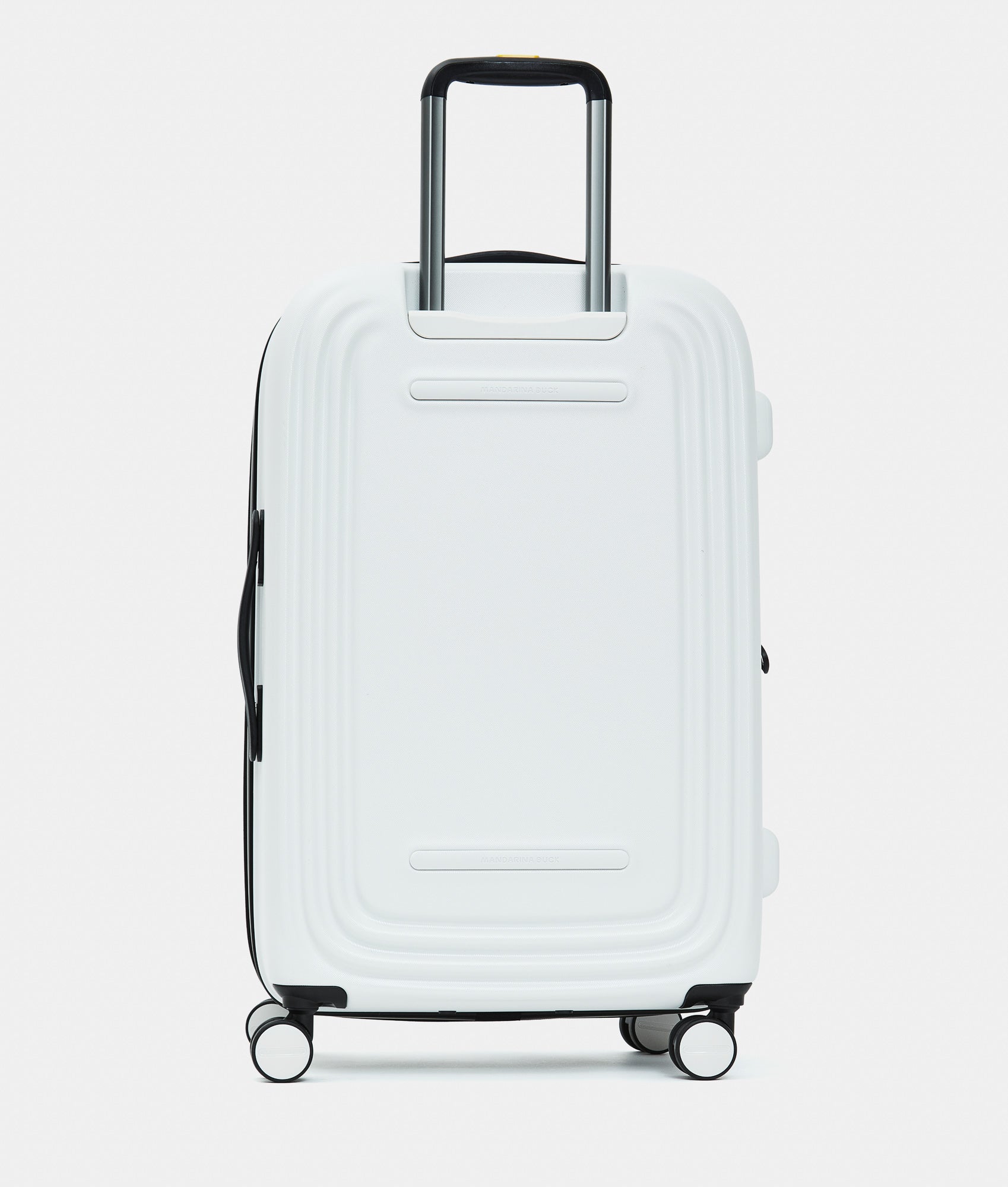 Scocca rigida in policarbonato, linee morbide e volume compatto.