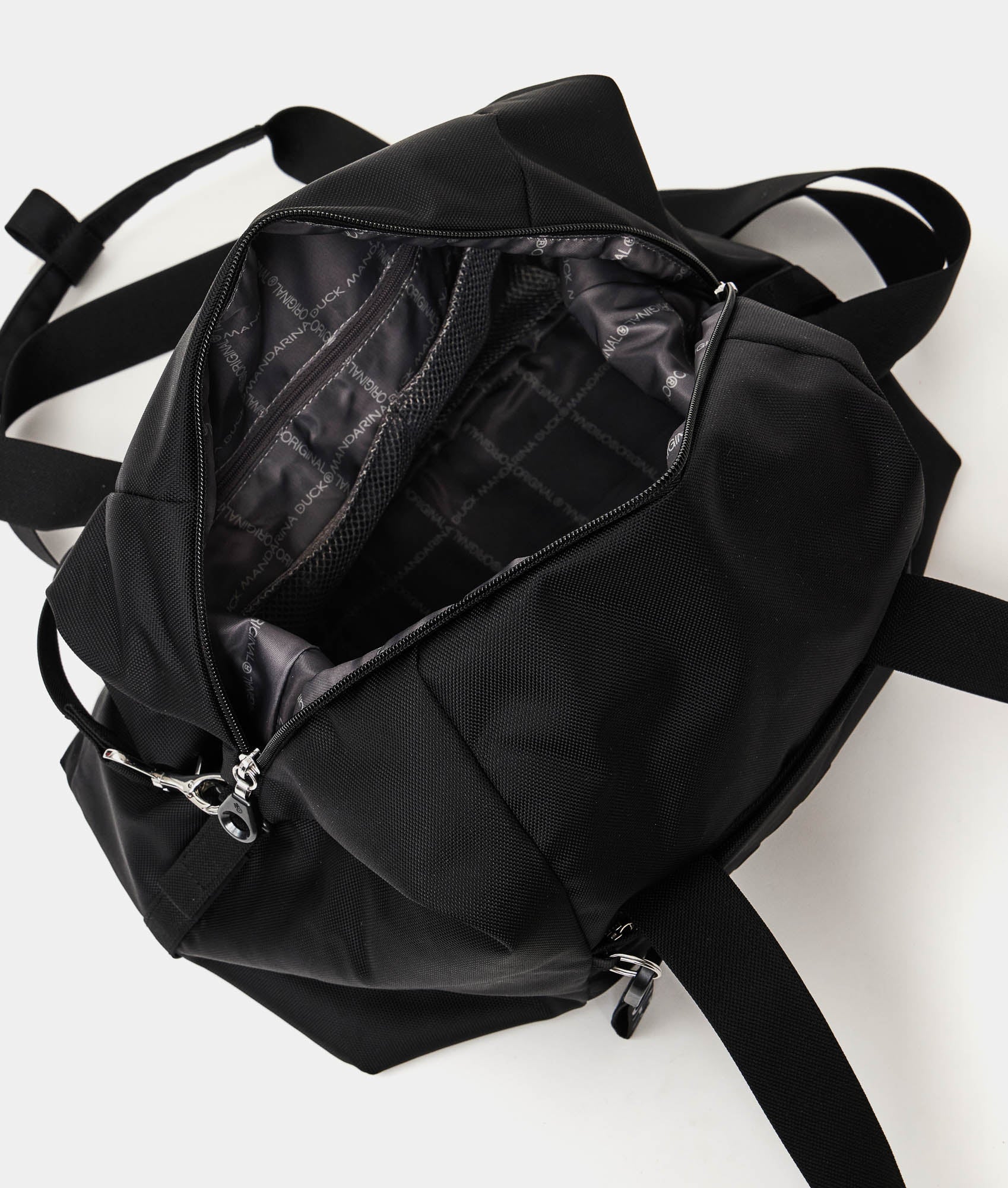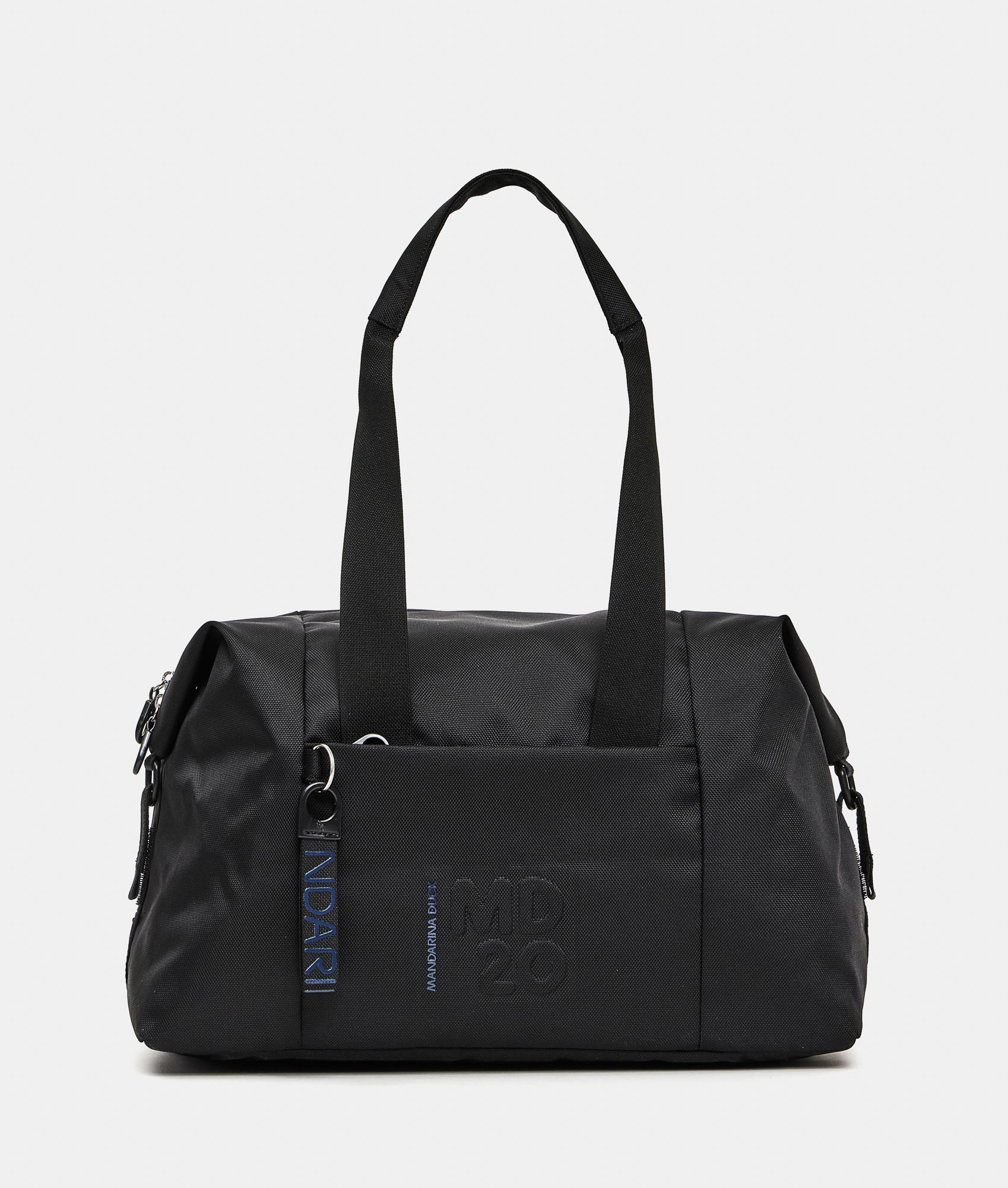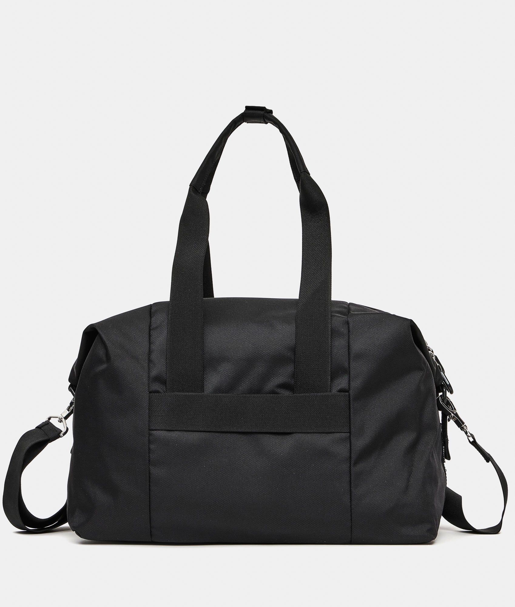 Duffel bag with handles and adjustable, removable shoulder strap in fabric. Personalized details, double portability.