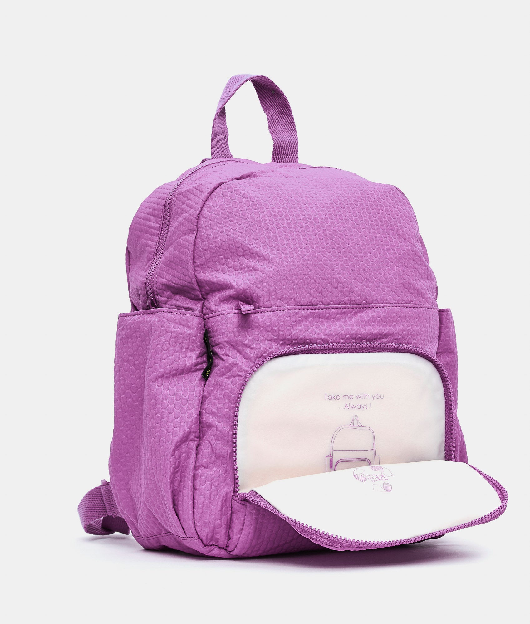 The material features a texture reminiscent of bubble wrap, with vibrant colors and a contrasting recycled lining. Each model is foldable and can be stored in a transparent pearl-colored pocket, which is an integral part of the product itself. This pocket can also be used to store small items, enhancing the bag's practicality.